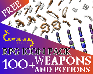 A 16x16, 32x32 and 64x64 beautiful potions and weapons icon pack for your game to use