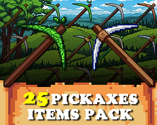 A downloadable asset pack with 25 unique pickaxes sprites!