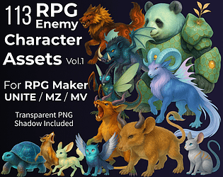 100+ enemies/monsters—PNG sprites with shadows for UNITE/MZ/MV; clean scaling, numbered previews, CSV names.
