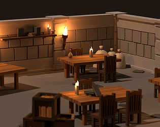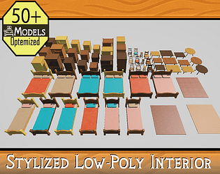 Stylized low-poly furniture pack with 57 assets, texture variants & cozy wood style great for interior scenes.