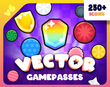 Over 30 pre-made GamePasses ready to be used! Designed in a cartoony, bold style sure to fit nearly all games!