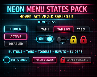 A neon-styled HTML5 / CSS icon pack with ready-made UI icon buttons for menus, HUDs, and in-game overlays