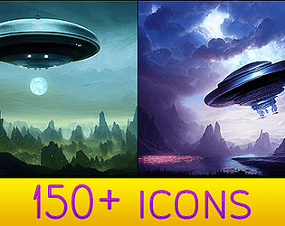 High quality 4k icons featuring classic sci-fi concept art looks, focused on space-like things