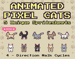 Five charming 32x32 pixel cats, each with 4-directional walk animations—perfect for RPGs, simulators, and cozy games.