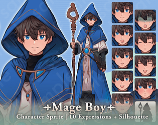 A full-body sprite of a brown-haired mage boy in a blue cloak. Includes 10 expressions and 1 silhouette.