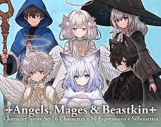 A discounted bundle of 6 fantasy characters—angels, beastkin, and mages. 10 expressions + silhouette each.