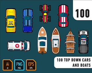 100 high-quality cars / boats. This asset is perfect for a top-down game.