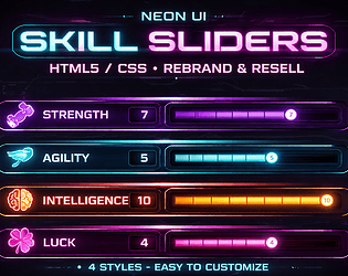 Neon-themed skill/stat sliders for RPGs, idle games, and character progression screens.
