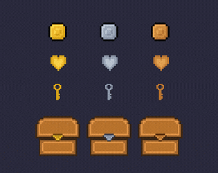 Pixel art animated chests, coins, hearts and keys in gold, silver and bronze!