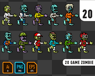 20 high-quality zombies. This asset is perfect for a side scrolling game, or even a turn based RPG type game.
