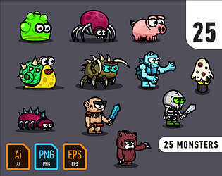 25 high-quality 2D monsters. This asset is perfect for a side scrolling game, or even a turn based RPG type game.