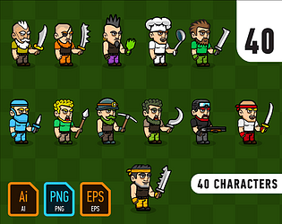 40 high-quality characters. This asset is perfect for a side scrolling game, or even a turn based RPG type game.