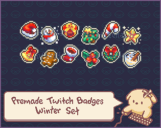 12 unique Winter items pixel art designs for twitch sub badges/bit badges.