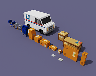 Voxel Mail package asset with 8 package styles a mail truck and some mail posts
