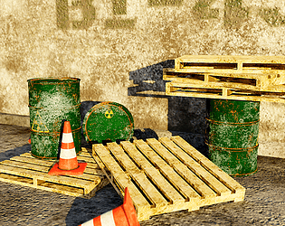 Amazing game ready wooden skid aka pallet, barrel and a traffic cone, with PBR textures