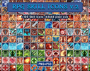 100 pixel art style skill icons of RPG graphical inventory element.