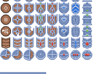 A downloadable asset pack with 32 unique shield sprites!