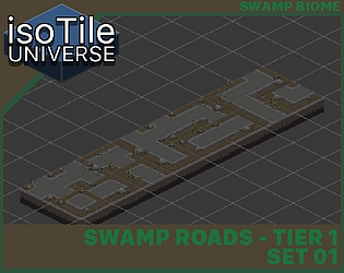 A set of 16 swamp roads - tier 1 4-direction isometric tiles.