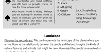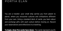 You are a traveler : your small ship carries you from planet to planet, where you encounter cultures and civilizations different from your own. Using only a standard deck of cards, you learn about and exchange gifts with each culture before moving on. Record your observations and reflections in a travel log. Inspired by "Alone Among the Stars" by Takuma Okada, and my own desire to practice models of meeting "the other" outside of the western tropes of colonialism, objectification, and exoticization that I grew up with.