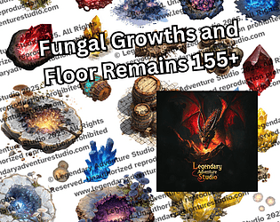 155+ top-down PNG + Dungeondraft assets of fungal growths, glowing spores, cave debris, and buried crystals.