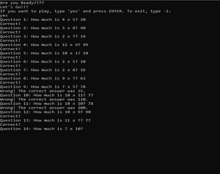 A fun command-line game to practice multiplication with random questions and score tracking.
