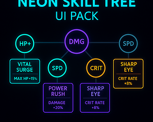A neon-styled HTML5/CSS Skill Tree UI pack including nodes, branches, perk cards, tier lines, and unlock effects