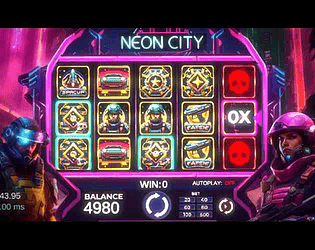 A neon-style 5-reel slot machine HTML5 template featuring smooth animations, auto-spin, and classic symbols.