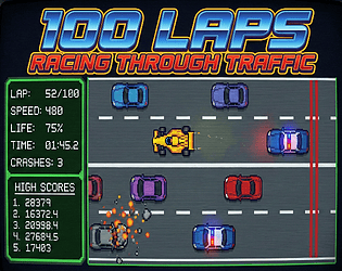 A retro top-down arcade racing game where you reach 100 rounds as fast as possible, avoiding crashes and the police.