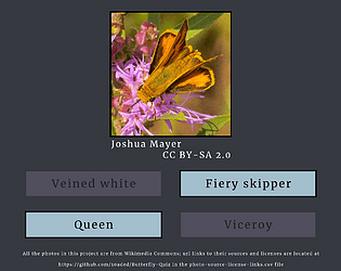 A simple multiple choice app do help learn the names of familiar butterflies native to North America. Programmed in Zig.