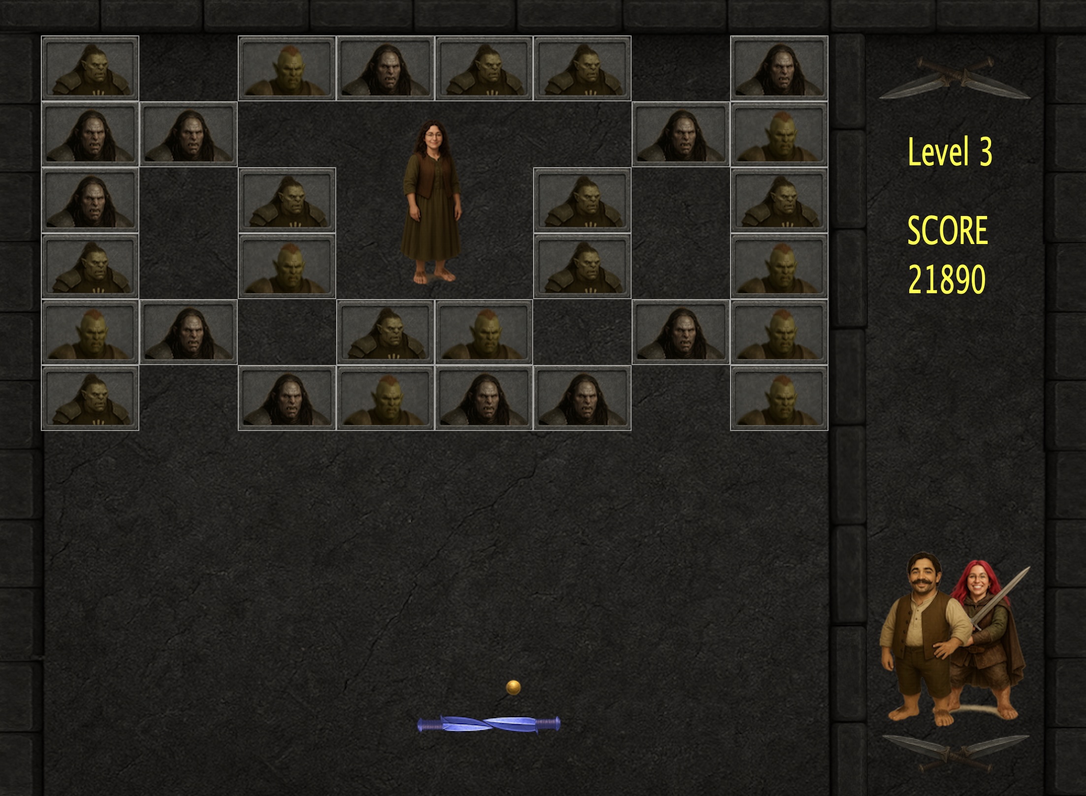 The Lord of the Bricks fuses the timeless gameplay of Arkanoid with the rich mythos of Middle-earth.Players break through enchanted walls forged by Sauron himself, rescuing kidnapped members of the Fellowship while traversing dark, gold-lit stages that echo the aesthetics of Tolkien’s world.