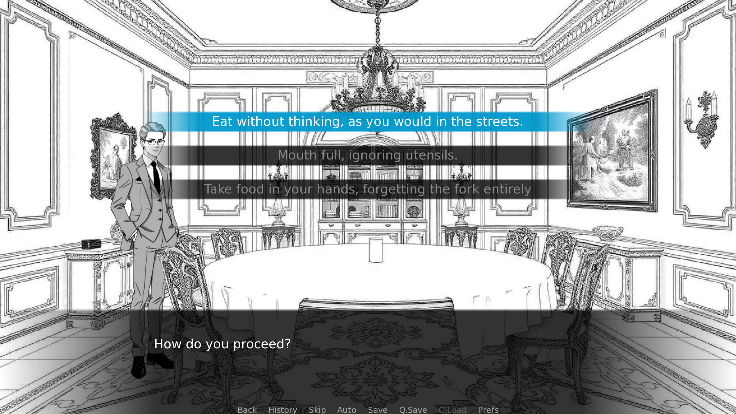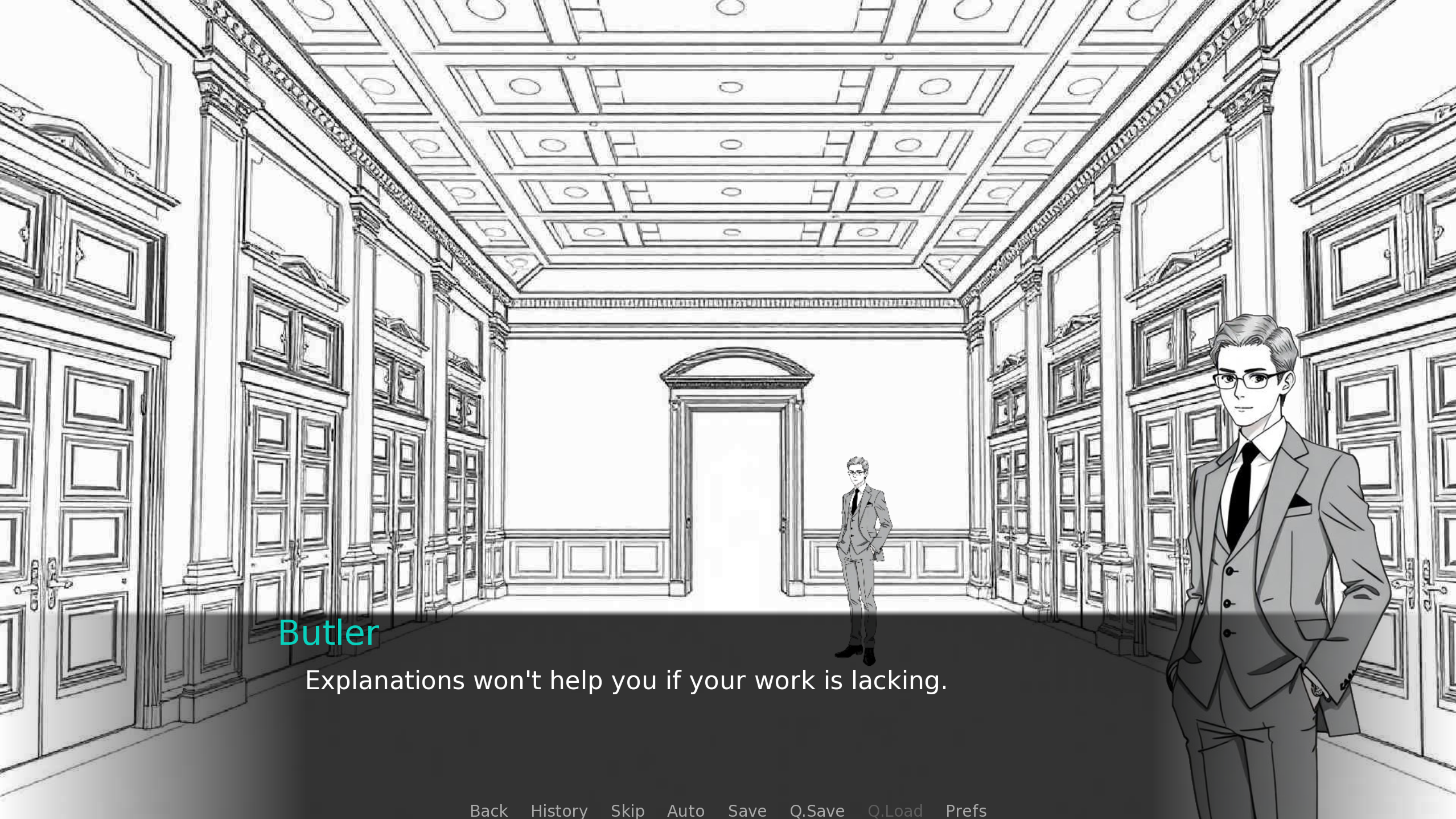 Well made from start to end, kudos to you! Nice music, nice black-white artworks, although modern kitchen clashes a bit with old-fashioned mansion, hehe. Wish there were branched dialogues with a few multiple endings.