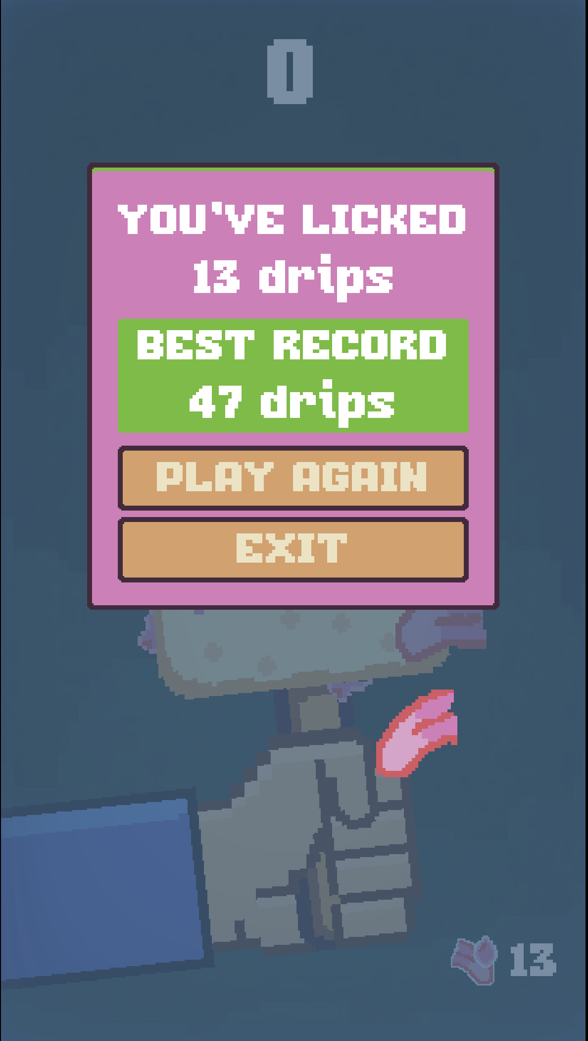 I dunno why that hit me like it did. For your first game jam, this is great! Such a unique idea and the music was thematically appropriate. I got 33 licks!