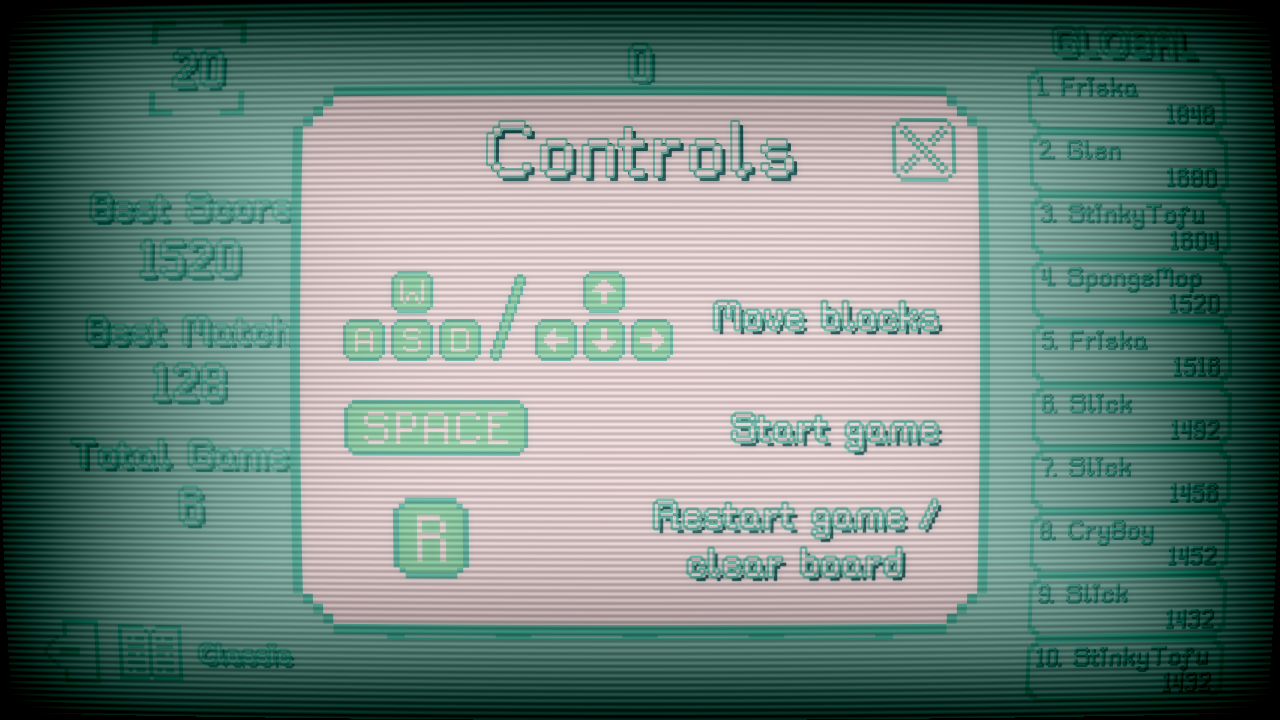 This is good! The UI and sounds are all very satisfying. Maybe I'd suggesting toning down your CRT effect a little bit, I found that it makes the screen a bit dark and hide your cool color palette. Good job!