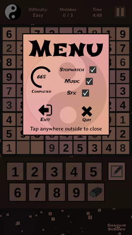 Sharpen your mind by crunching numbers in a relaxing way! The Yin Yang is a concept of dualism. There must be some darkness in the light and some light in the darkness. Shaolin Sudoku borrows this idea and presents it in an aesthetic sudoku...