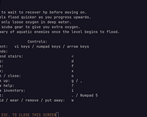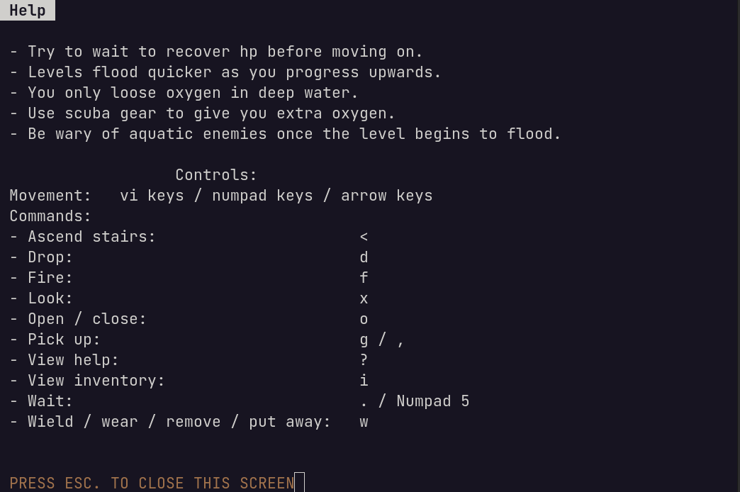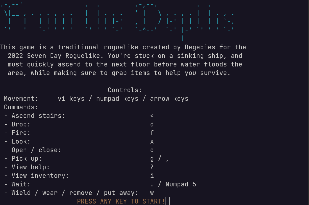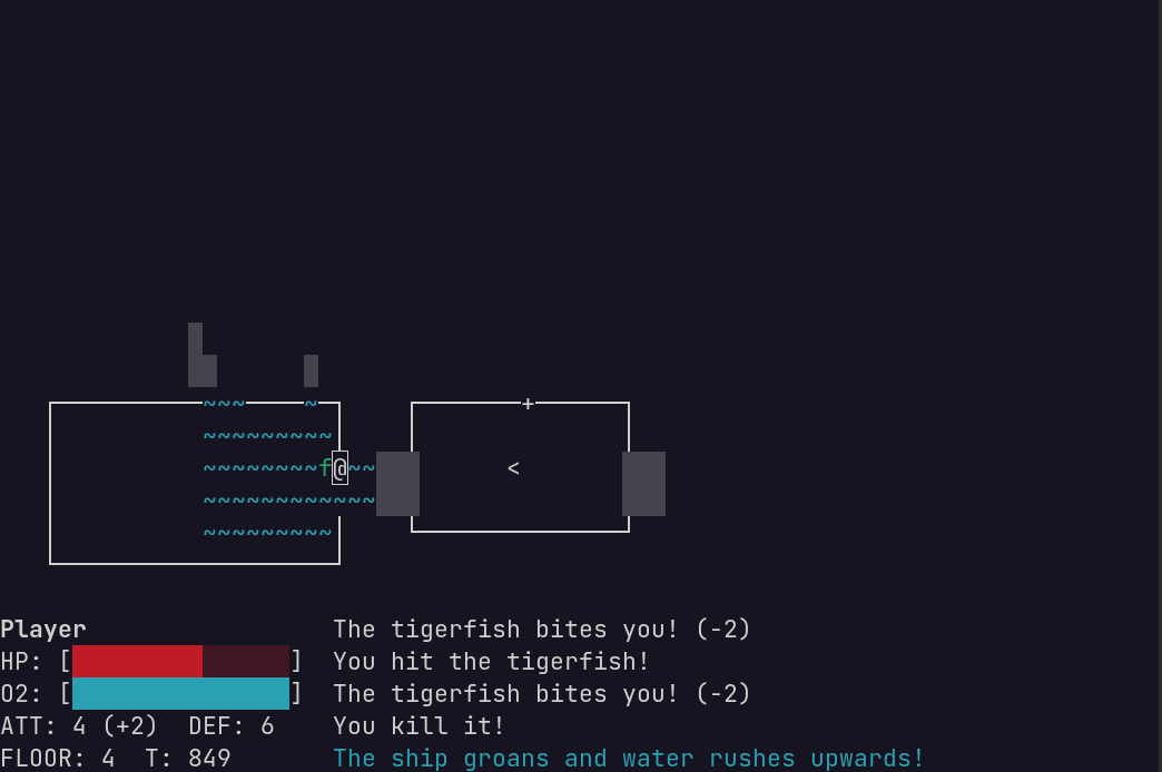 I like the difficulty in this game. The concept of escaping a sinking ship is fun, and the feeling of panic of being chased by rising water rushing through the ship is conveyed very well. Despite some polish stuff - where the game occasionally segfaults on startup, < to ascend seemingly not being listed in the controls, no clear way to reset after a death, the game gets the fundamental fun of roguelikes right, and it does it in a unique way. The player is transported into a situation, and they must use all their available resources to react to that situation and survive. It provides that fun instantly, and that's why I enjoyed playing it.