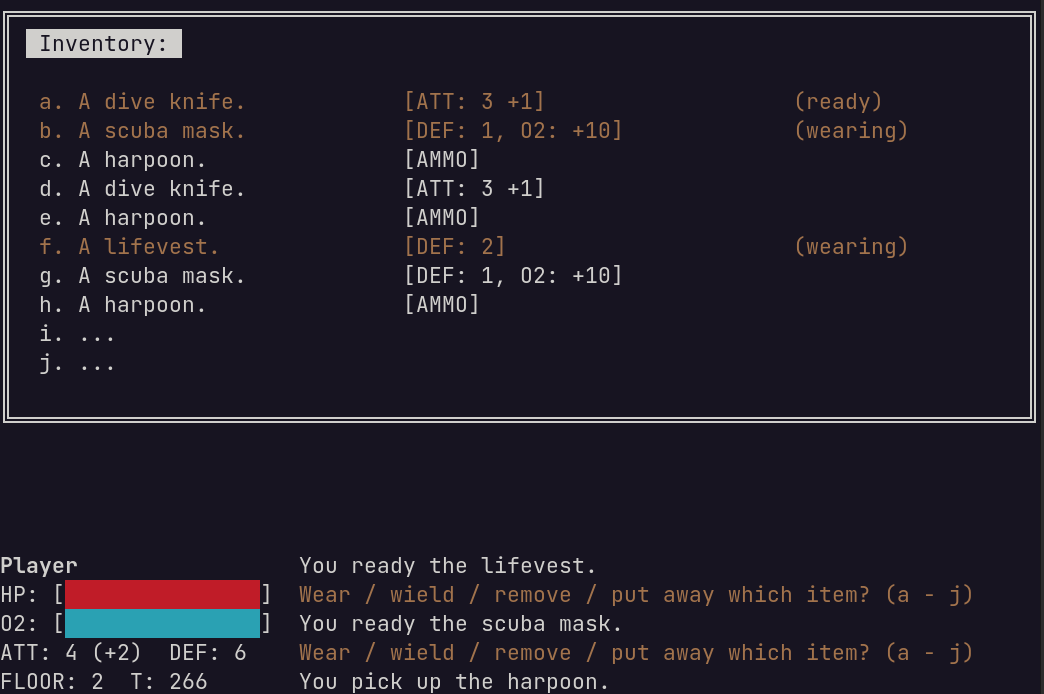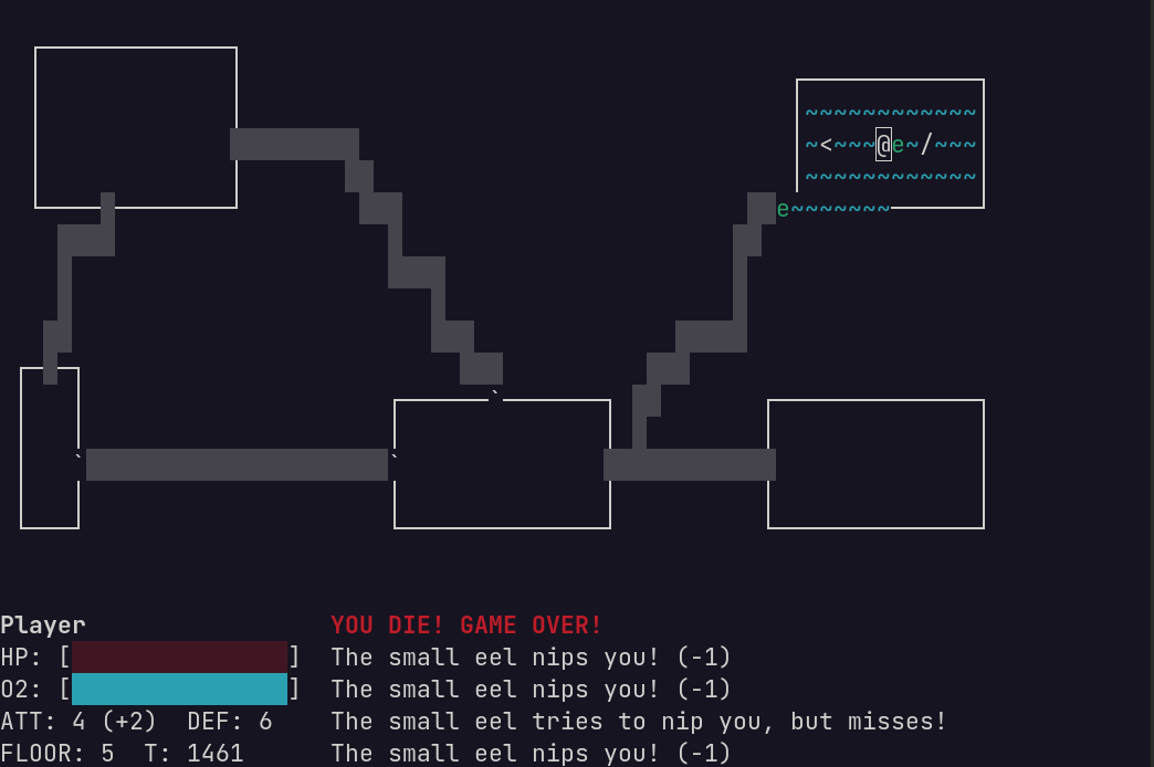 Yeah, it is pretty easy in its current state. I didn’t really have the time to do much balance, and I deliberately made it easier this time since people complained about my last 7drl being too hard. I would like to add far more aquatic enemies, the water being about to shove you around, the water becoming electrically charged, etc… And setting it on an underwater research base does make more sense. Thanks for the tips!