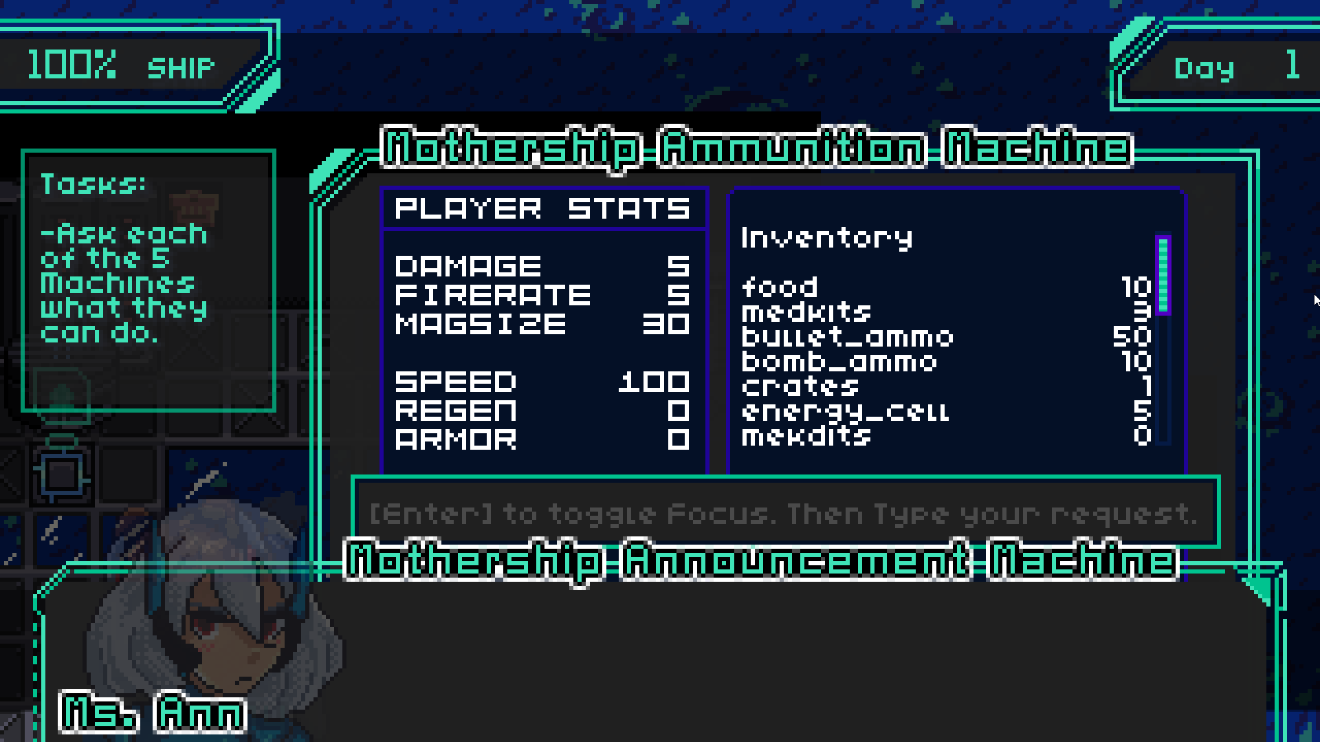 Funny thing on day 2, still not sure if it was a bug or not. I noticed the bio_mass was negative in storage, figured it was a bug. But when I talked to Stera, she kept saying stuff like "Negative biomass, glitch detected! Please ask Ms Peyre to fix", so I thought, oh cool, that's actually an event! ... but then Ms. Peyre told me to check with Ms Munny, then Munny to check with Peyre, etc.... so I don't know anymore xD. Was this a planned thing?