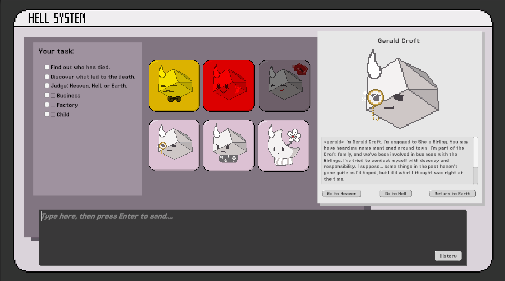 Cool AI-powered murder mystery. I had some trouble with the interface, it was too zoomed in by default, so I had to zoom out with browser controls to play. Also, I like the music and sound effects, they're very important for a game like this.