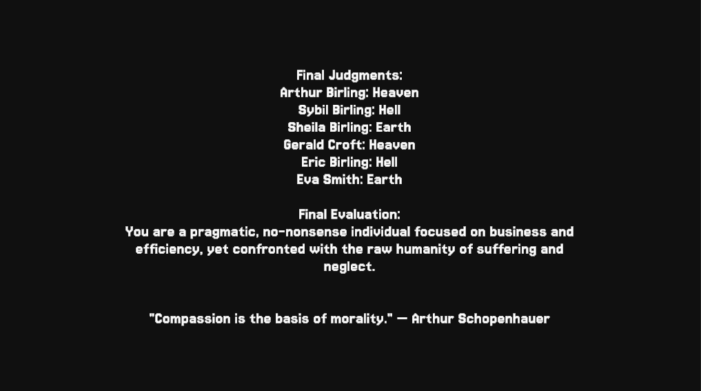 - I am a sucker for stuff like the final evaluation for replay-ability purposes! The story is great, sound and idea is brilliant. The only issue I really had was the chat box for the AI being a bit buggy, so I had to refer to the history tab to see my convo with the bot. Well done and thank you for submitting!