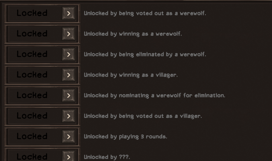 - Hey hey! I like the assets you picked for this game, the theme is cute! I like the sound effects and the use of the AI. It's the most responsive that I have seen so far from the entries! My only nitpick is some light background music and adjustments to the AI so that you don't need to address individuals but rather always have it address "everyone" as long as you specify name of characters to respond back to. I.e. If I speak directly to Cambion, instead of selecting Cambion for my reply it would be nice if they respond because I addressed them in my message. It also broke for me when electing someone to vote out as the werewolf. Creative use of the AI!