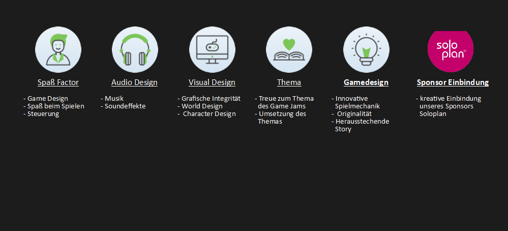 - Das Thema des Game Jams muss in das Spiel eingebaut sein und das Thema sollte erkennbar sein. Falls es auf den ersten Blick nicht genau erkennbar ist, dann schreibt bitte bei der Abgabe hinzu wie es integriert wurde.