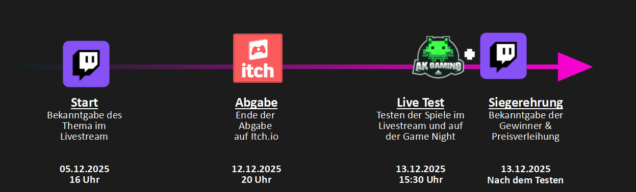 Das Thema des Game Jams wird am 5. Dezember 2025 Live auf dem AK-Gaming Twitch Kanal verkündigt. (Aber keine Sorge falls ihr den Livestream verpasst, wir werden nach dem Stream das Thema auch auf dem AK-Gaming Discord und hier auf der Itch.io Seite posten)