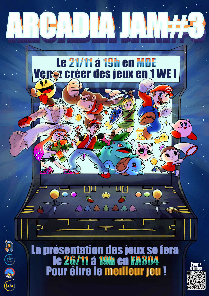 L’ArcadiaJam commencera le vendredi 21 novembre à 19h dans la MDE (on vous donnera la salle dès qu’on l’aura).