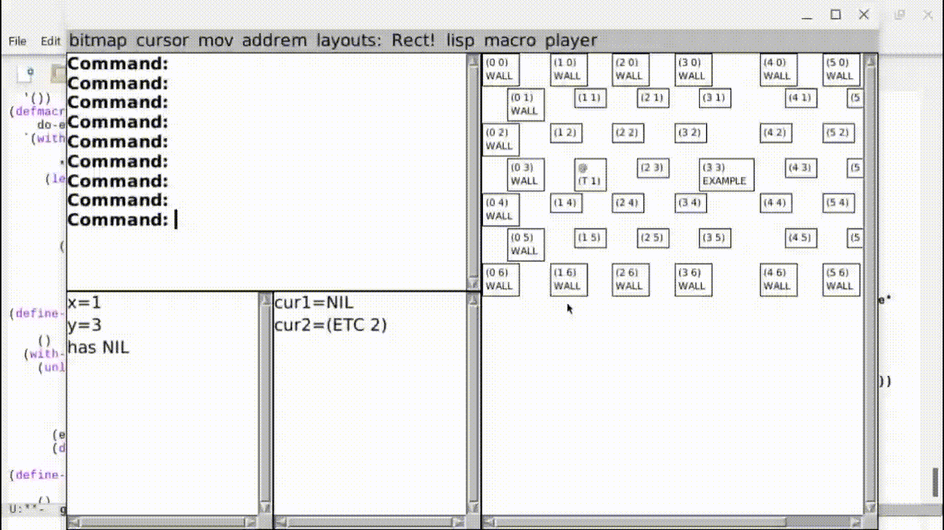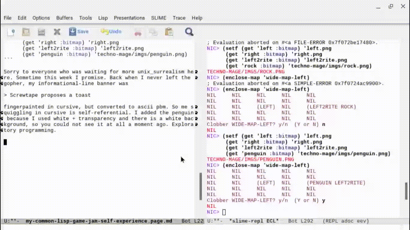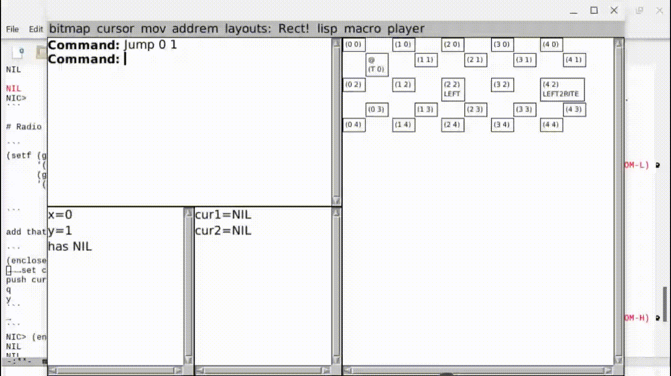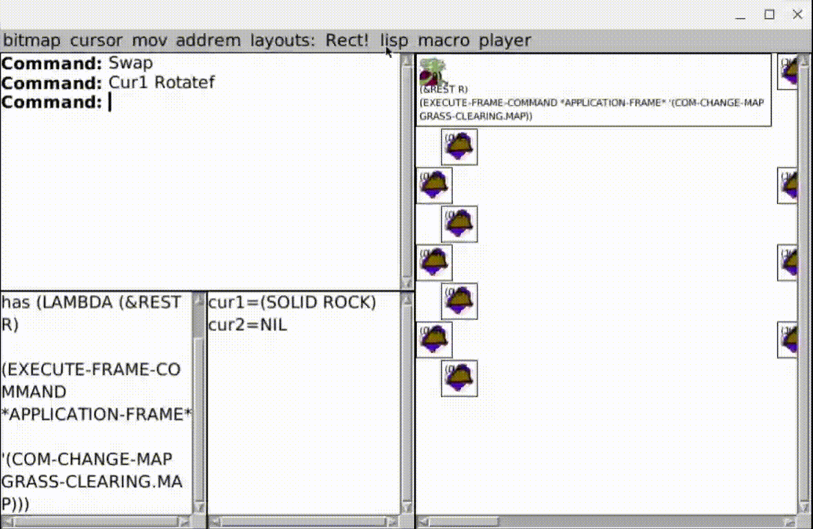 My NicCLIM is really just the clim 2 spec’s formatting-table macro and McCLIM as such. I am trying out writing reuseable #codeTooting toots as a style, so the four zones/maps of my game initially were the REPL commands: