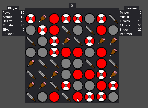 Game prototype where linking symbols increases your power to battle foes and raid settlements.