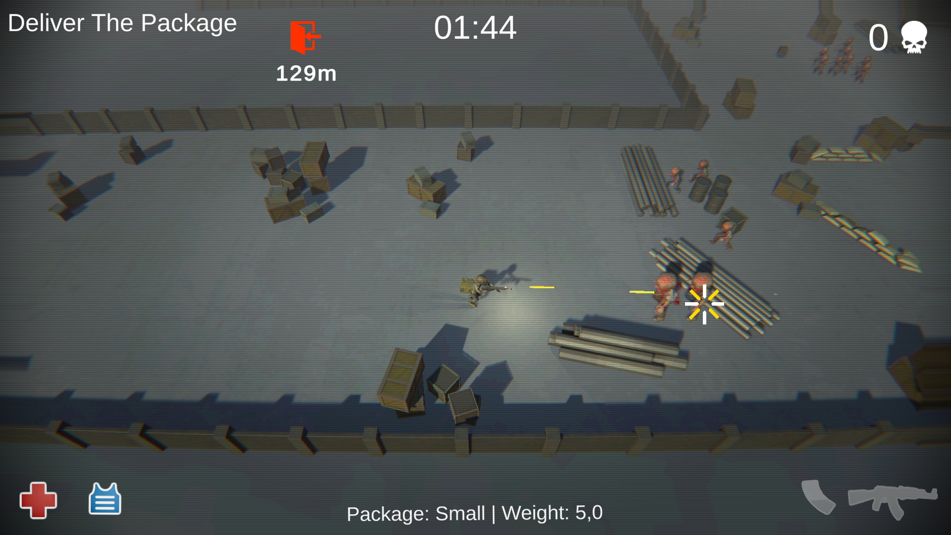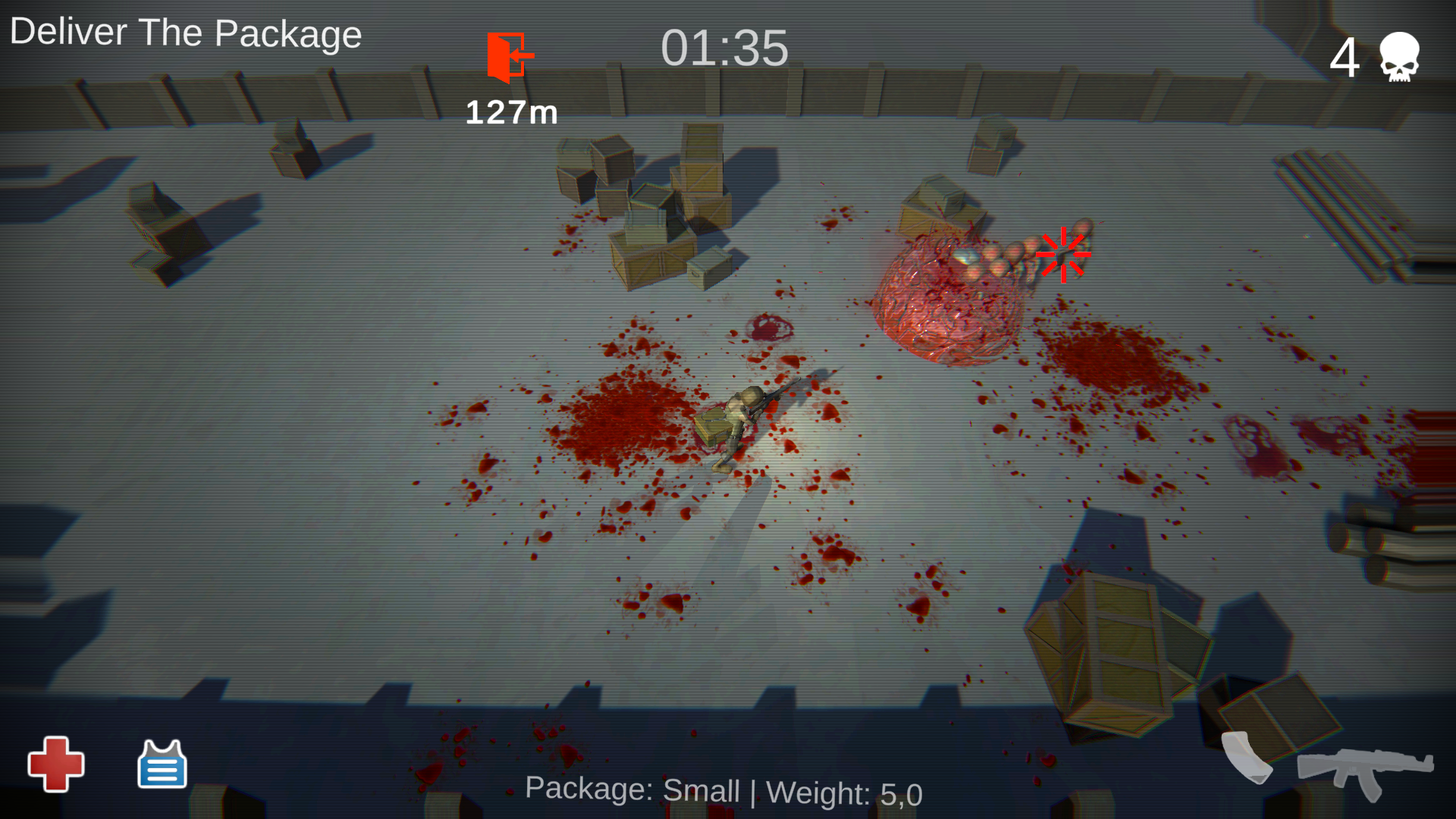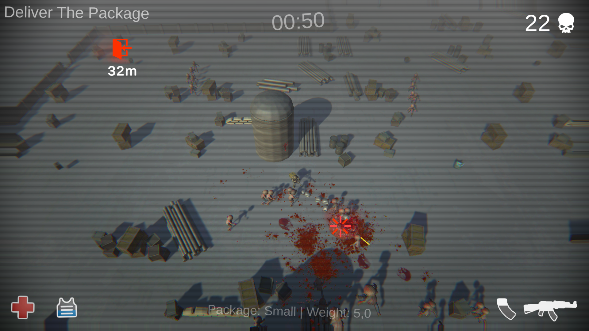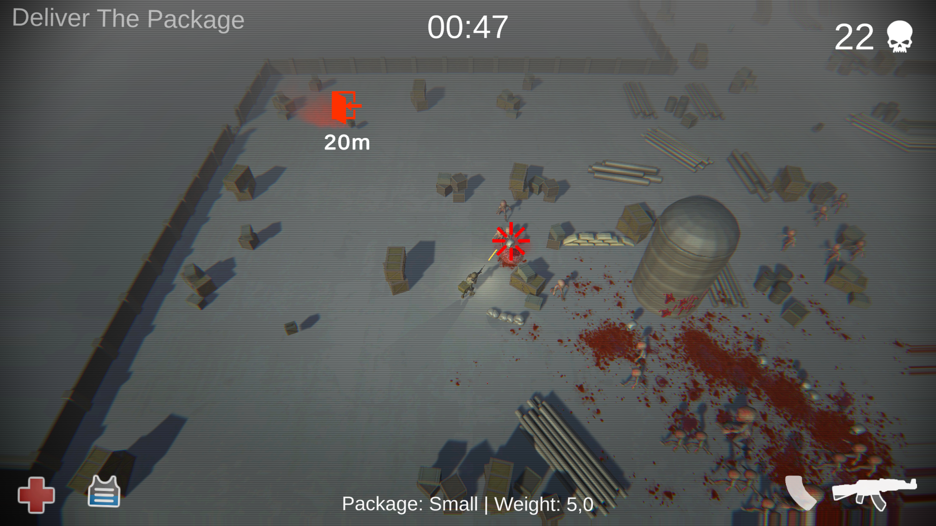 I actually got pretty hooked to this, I love the idea of needing to deliver packages in a wasteland. Since you play as a soldier, perhaps it's the result of a war? Anyways, the enemies are waaaay too creepy... They look like baby human-alien hybrids... The game play loop is simple but fun, core mechanics are there, and the upgrade system is really cool! If I had one complaint it'd be that when you fully upgrade your bullet speed, your magazine size doesn't grow so you shoot all of your ammo out extremely fast.