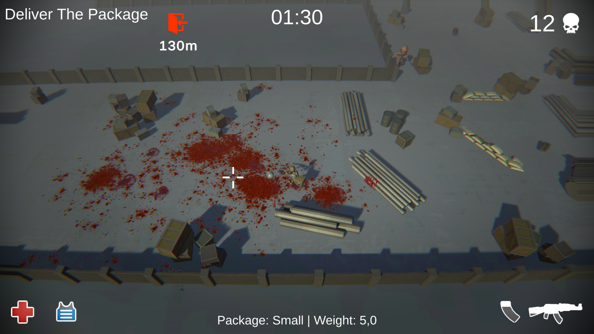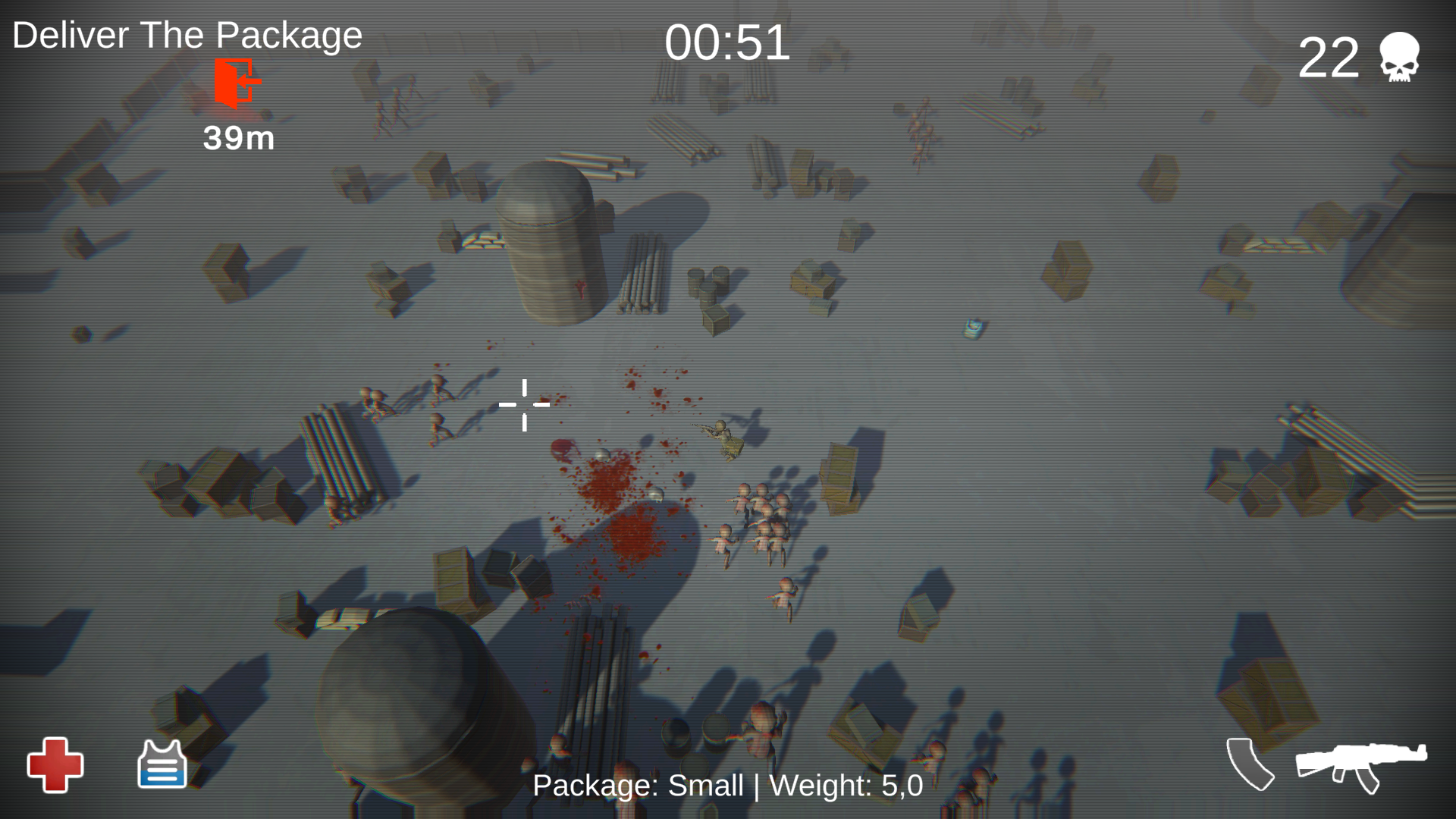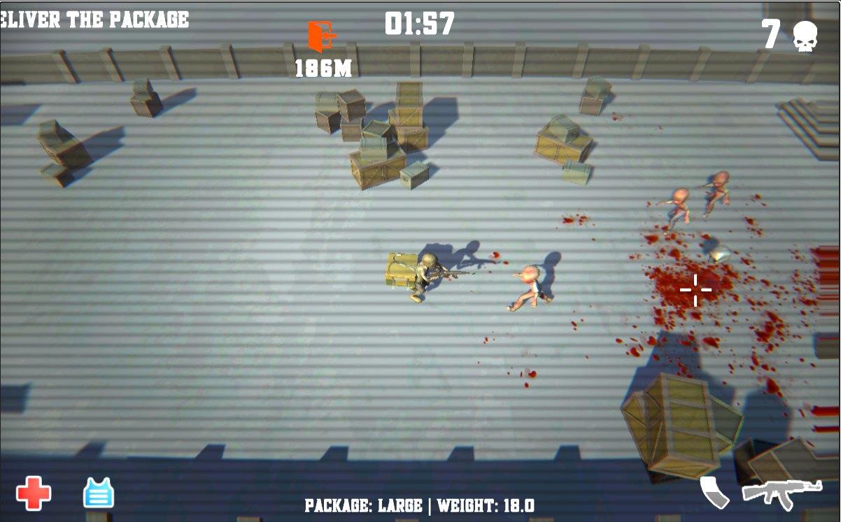 I actually got pretty hooked to this, I love the idea of needing to deliver packages in a wasteland. Since you play as a soldier, perhaps it's the result of a war? Anyways, the enemies are waaaay too creepy... They look like baby human-alien hybrids... The game play loop is simple but fun, core mechanics are there, and the upgrade system is really cool! If I had one complaint it'd be that when you fully upgrade your bullet speed, your magazine size doesn't grow so you shoot all of your ammo out extremely fast.