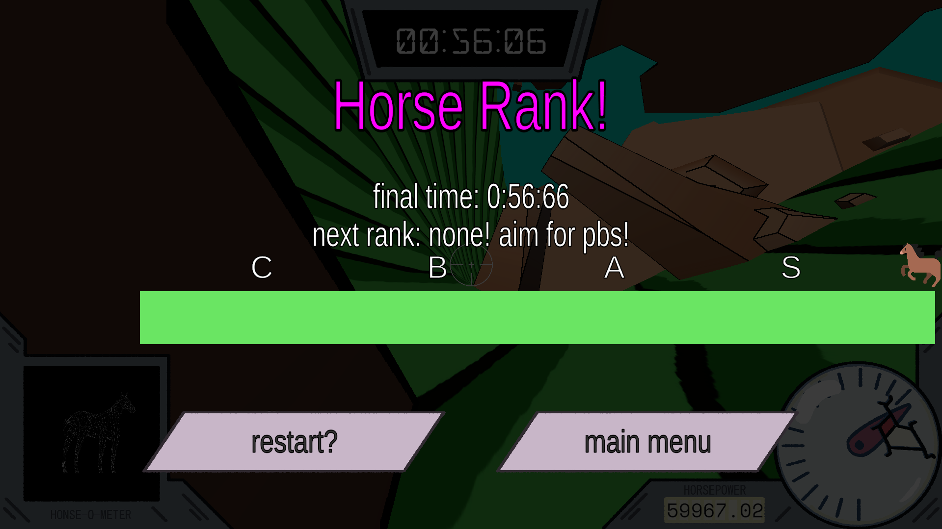 much to my chagrin, i had to don the horse-size flight suit bestowed upon me by the horse CIA to defeat the mysterious orb, probably to overthrow the democratically-elected fribbleflower canyon. despite operating undemocratically on behalf of a reactionary government, i had a blast. would demolish myself in a horse kamikaze against the impenetrable iron will of the fribbleflower freedom fighters again. 😩🐎💥