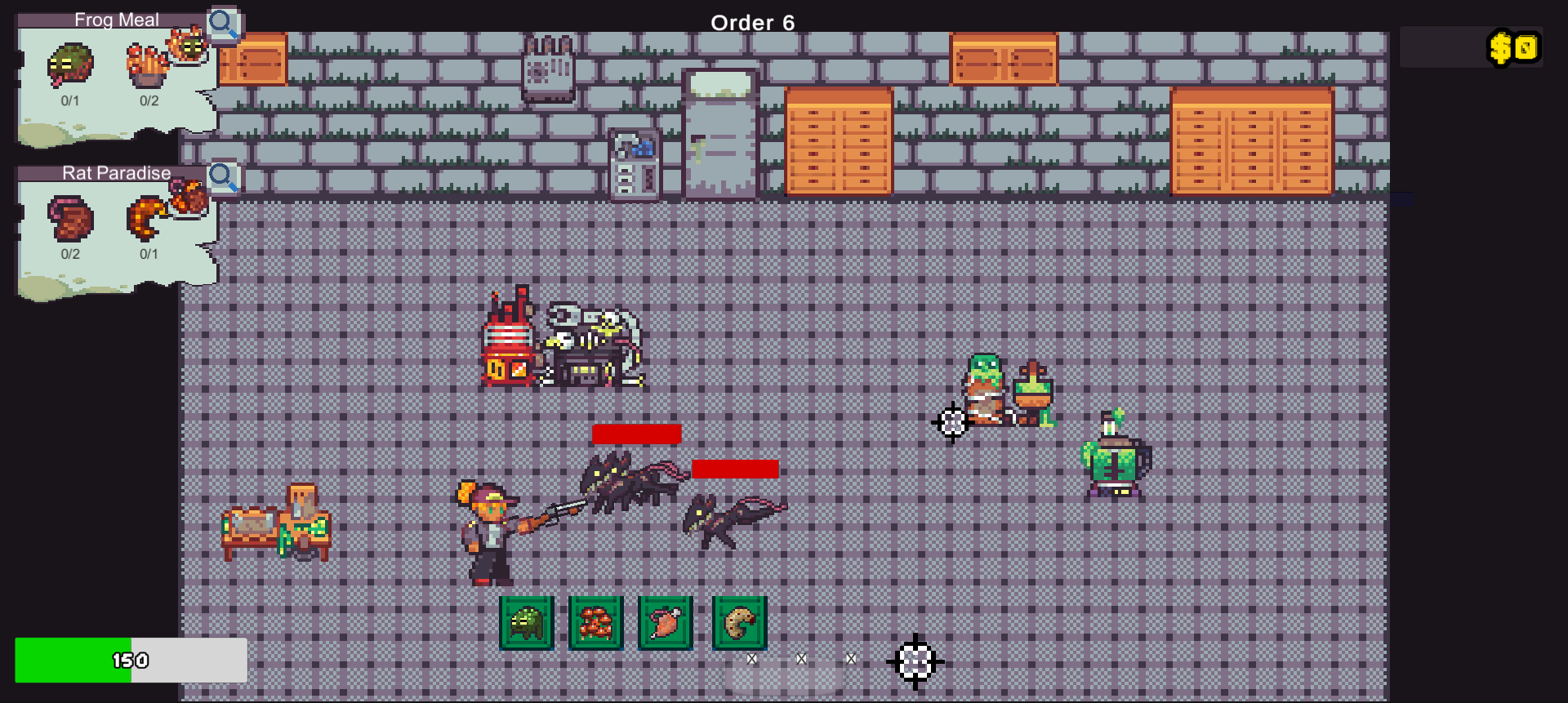 It got very chaotic very quick! I found out that the rats only come out after you pick an order and they're a set amount of them which was a relief. I enjoyed the game but I wish you could aim the gun with the mouse instead of controlling my position with the keys. Also the animation is pretty sick, especially the rat death sprites. Good job to the spriters.