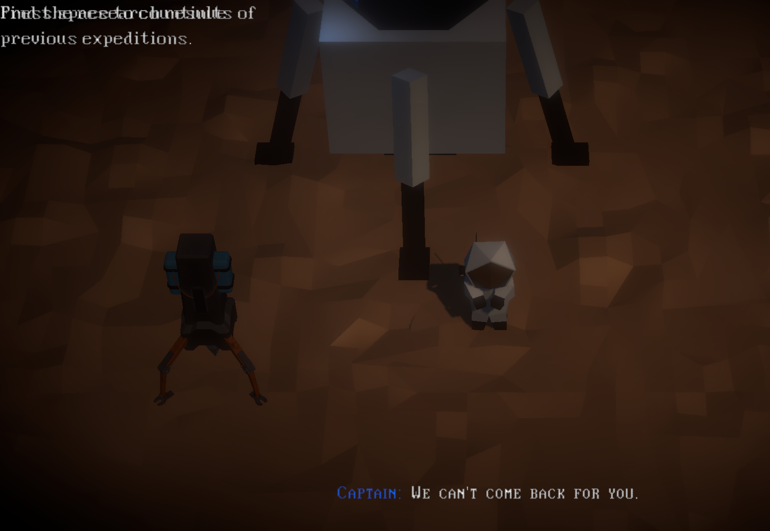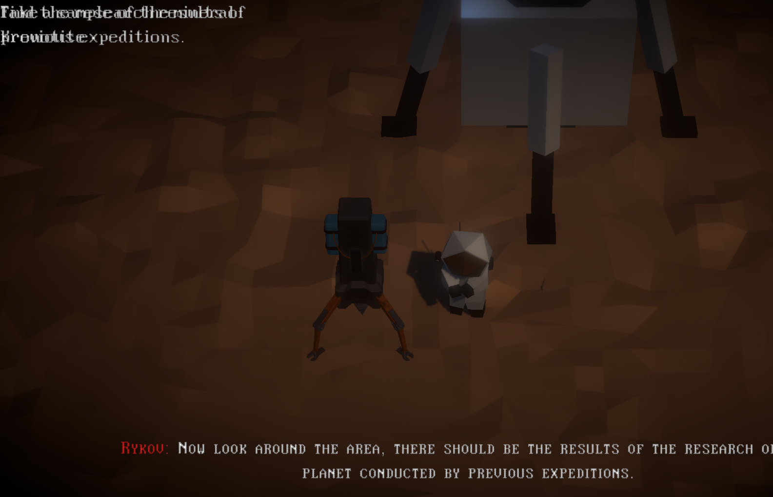Cool game I had a hard time finding the previous expeditions research and with the slow movement it took some time, I also don't think i ever grabbed the mineral sample things but it just had to play the dialogue I guess. Fantastic game idea, definitely had some eeriness to it!